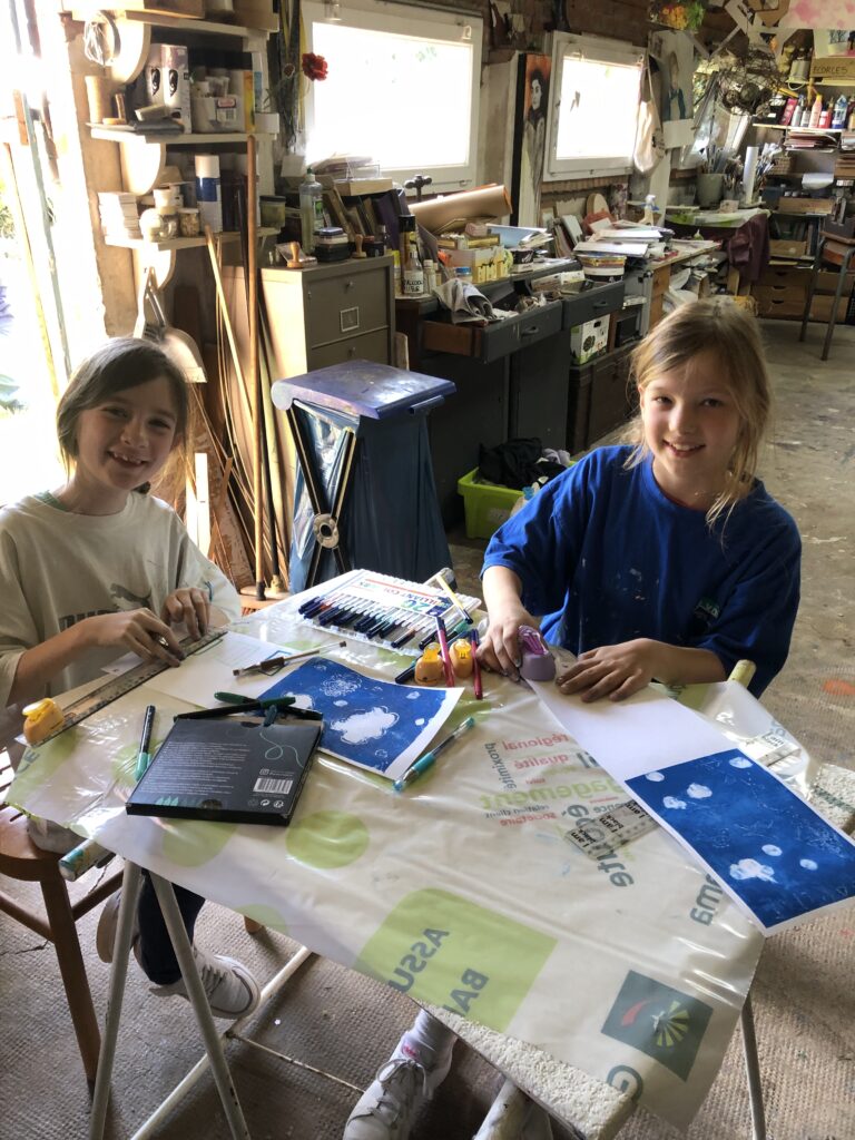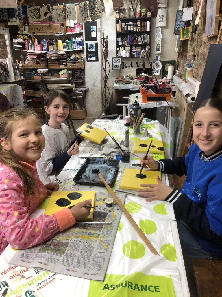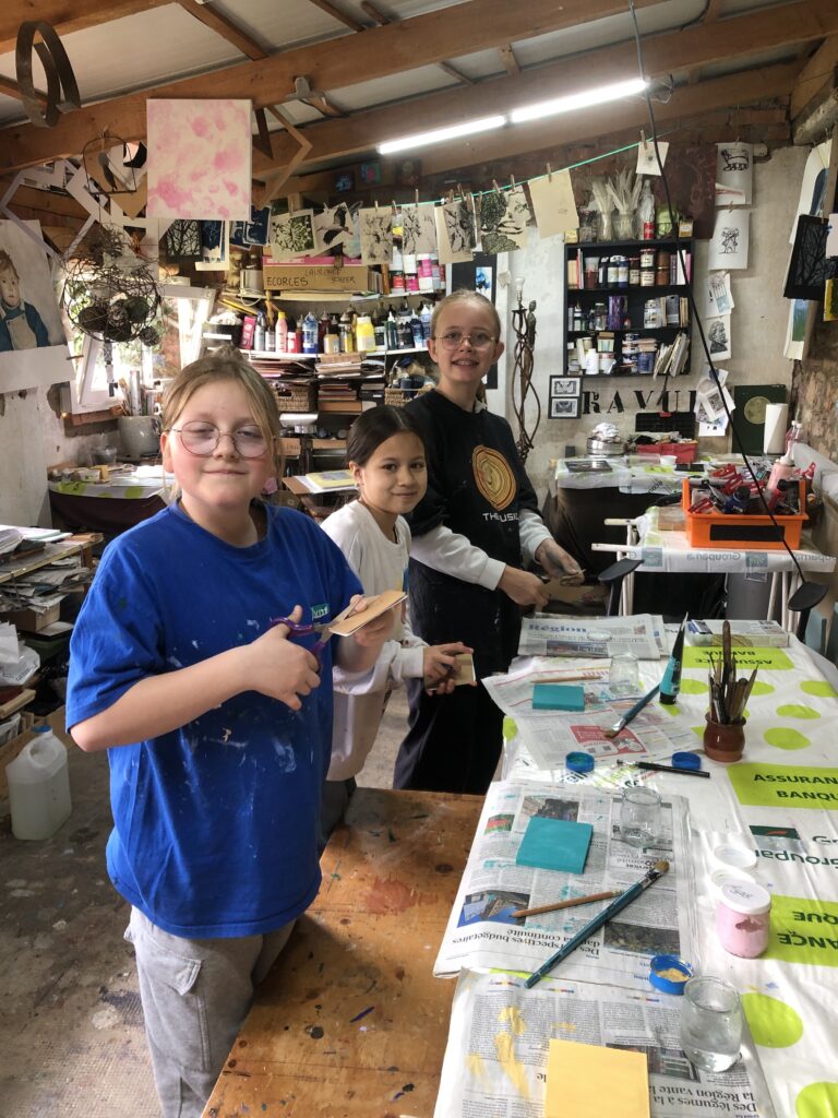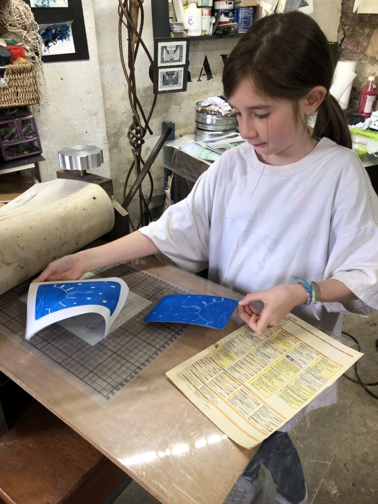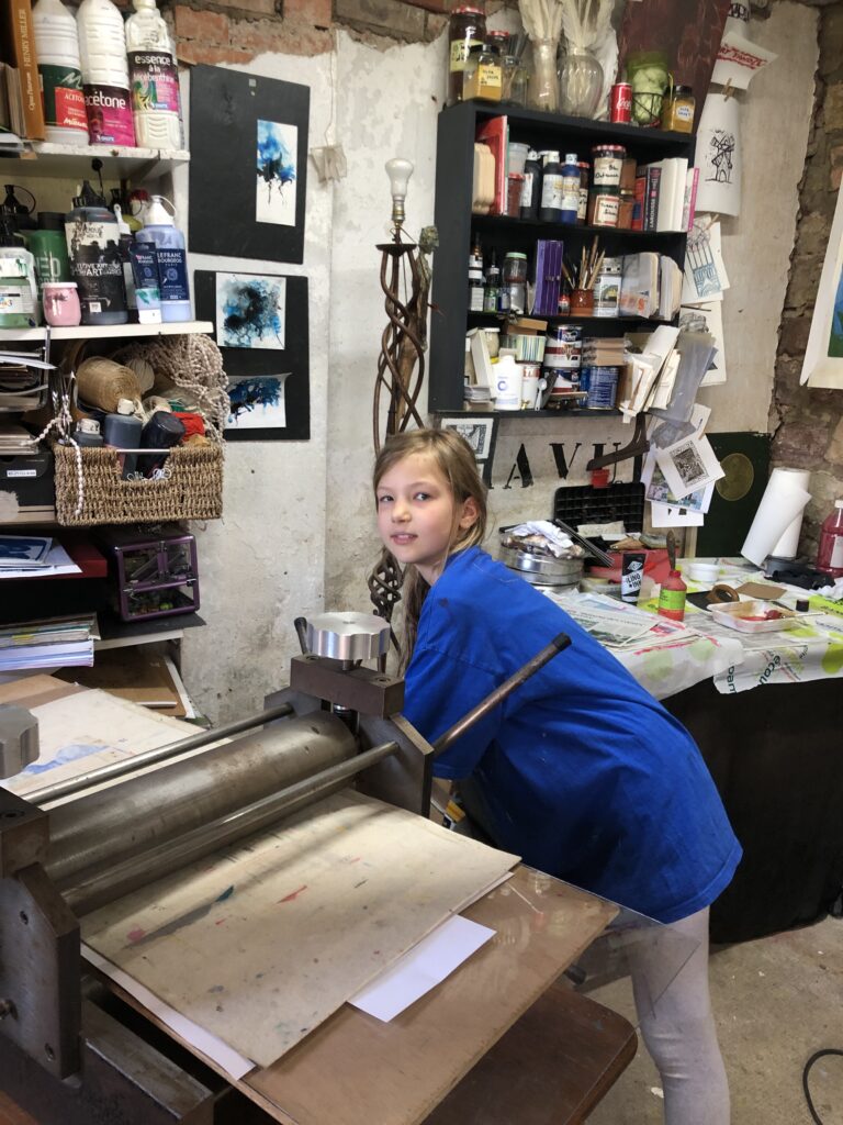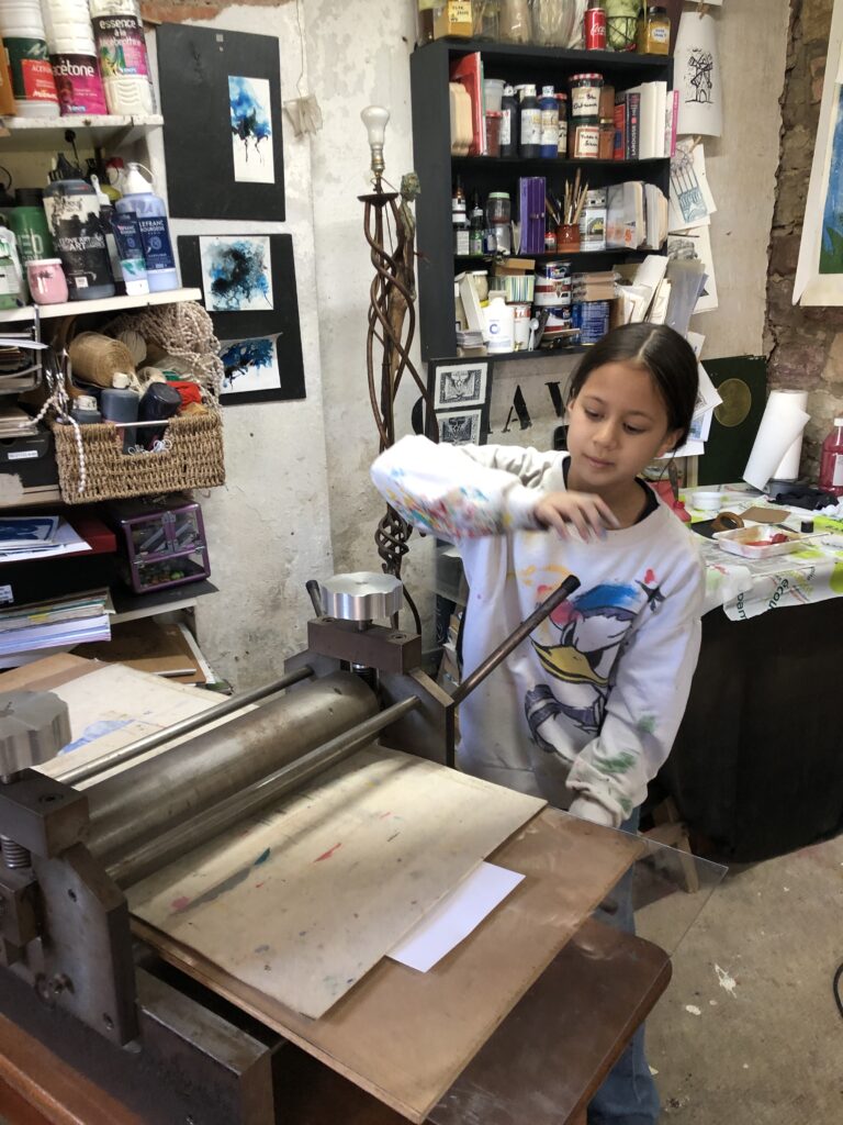 Et pour finir, nous avons abordé une technique de gravure : le monotype. Utiliser la presse est toujours un moment intéressant, quand on soulève la feuille de papier pour découvrir son impression.