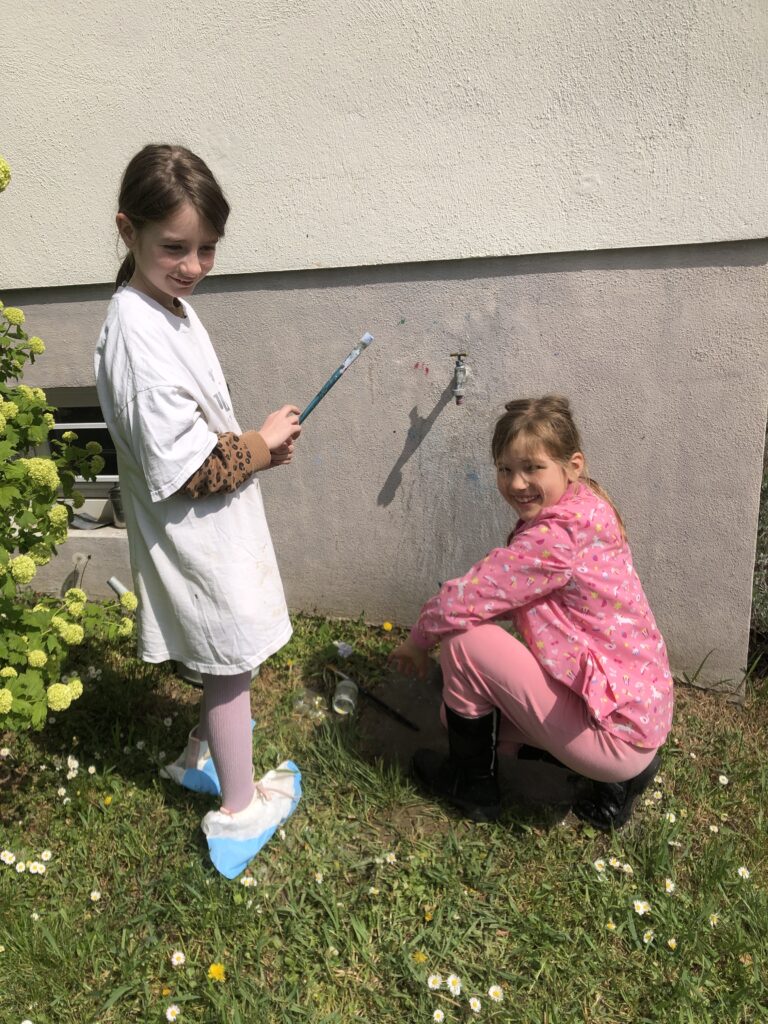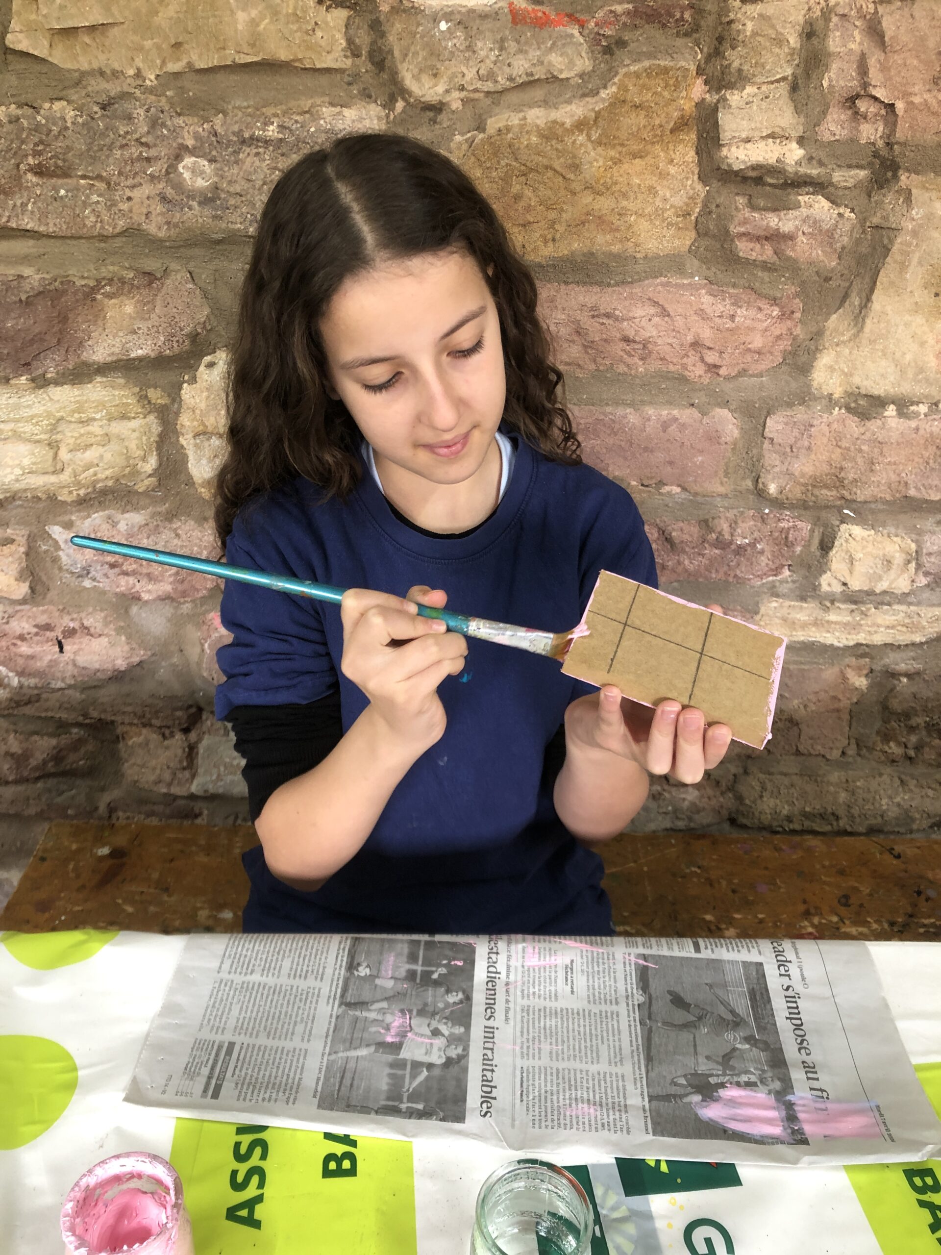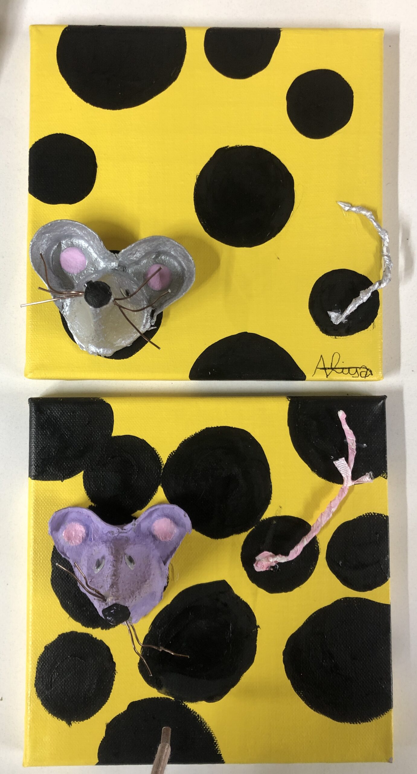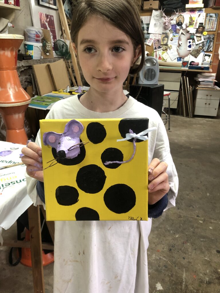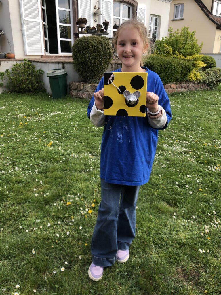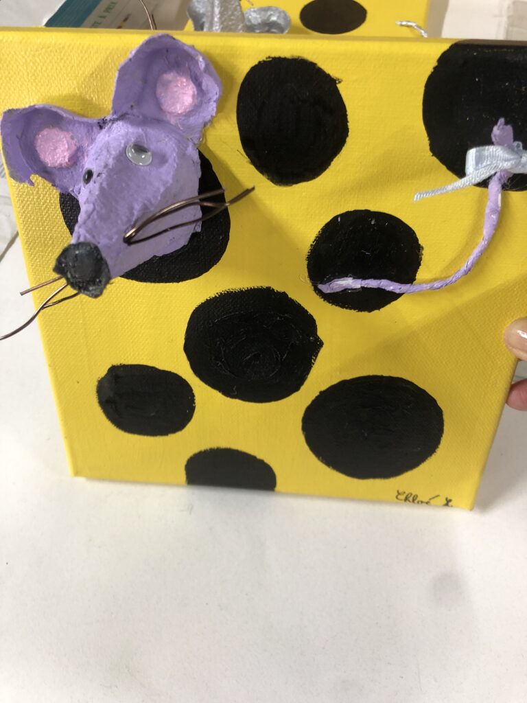 Une toile, une boite d’oeufs, de la peinture et un peu d’imagination … Et hop, dame Souris pointe son nez du fromage qu’elle grignote allègrement !